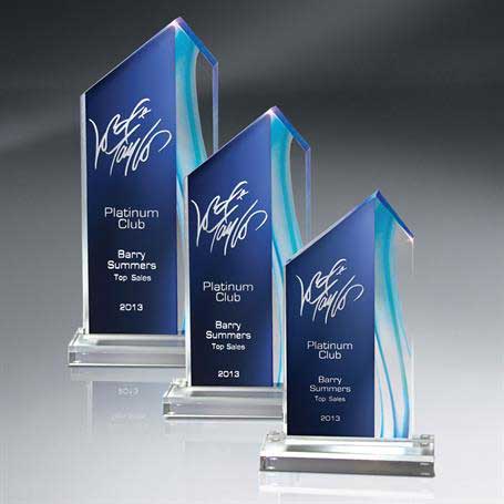 This versatile Laser engraved aqua colored acrylic is beautiful and will light up any office or desk. Recognize your best achievers with an award that sets them apart from the crowd. Available is 3 sizes.