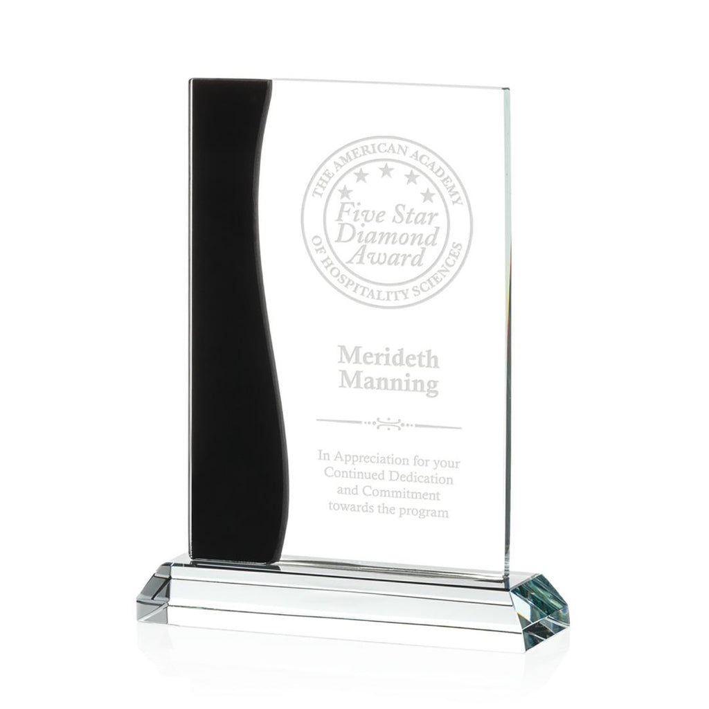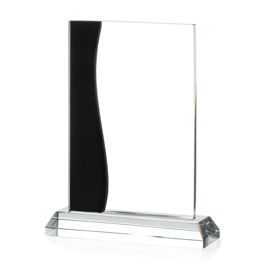 Rectangular starfire crystal is layered with a cut and curved black crystal accent, then mounted to a beveled starfire base, creating this formal award with contemporary flair. Available in three sizes, it is perfect for a tiered recognition program. The imprint area is large enough for your personalized message and logo. This quality product will look great on anyone's desk or bookshelf.