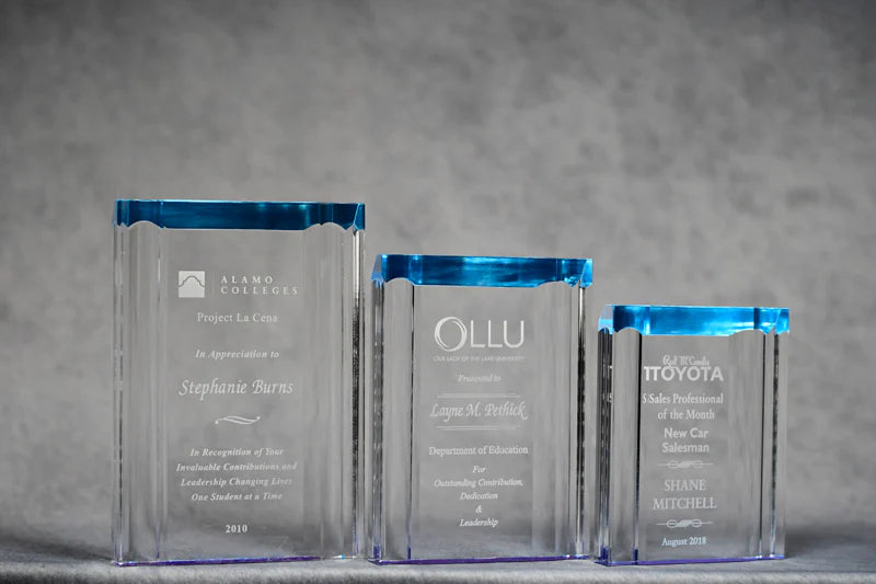 This acrylic is beautiful with the Blue mirror across the bottom. If you are looking to shine a spotlight on and recognize your best achievers, this is the trophy for you. Available in 3 colors(Blue, Gold, Red) and 3 sizes.