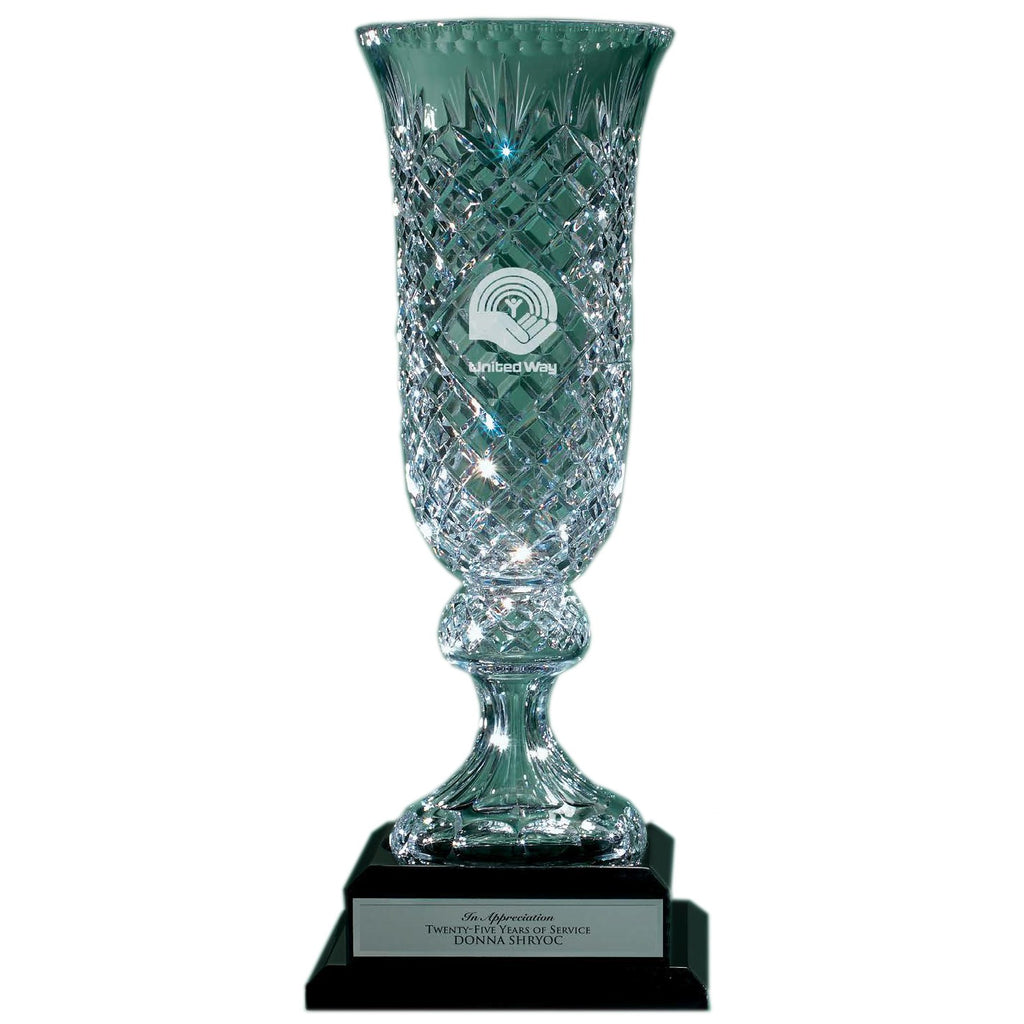 This Giant 18" sophisticated Hurricane crystal vase makes an impressive gift or award for many occasions. The addition of custom text and images make it a perfect and timeless recognition piece. Boost team productivity with this elegant token of appreciation. Include your logo and simple message of gratitude for a retirement gift. The optional black ebony base can be added to this item to increase its visual impact!