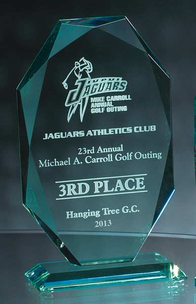 Our popular Jade Glass Multi-Faceted Elongated Octagon Award is presented handsomely on a matching beveled jade crystal base. Hand-cut beveled edges highlight each elegant piece and provide dimension and a beautiful reflection. This would make a memorable award or gift.