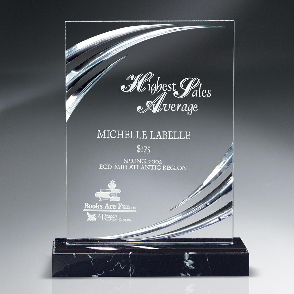 Introducing the Nouveau Rectangle Acrylic Award on genuine Black marble base. Made from high-quality acrylic, this award offers a sleek and modern design that is sure to impress. Perfect for recognizing achievements and milestones, the Nouveau Rectangle Acrylic Award is a top choice for any professional setting. Available in two sizes.