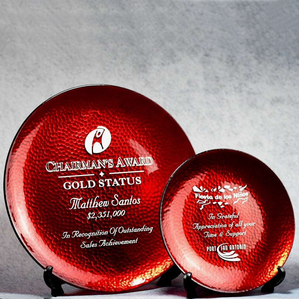 Platters and Trays are an award style that goes back over 50 years.  They are still used as awards for several famous tennis tournaments.  Here is a fresh new take on the engraved tray.  Hammered finished in gorgeous jewel tones, these glass plates or platters are a fresh mixture of traditional and contemporary styles that will mark any achievement as rich and unique. The red color on this tray is eye-catching.  Two sizes are available.  Your message and logo are etched to give a subsurface look.  A plate stand is included with this award.